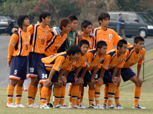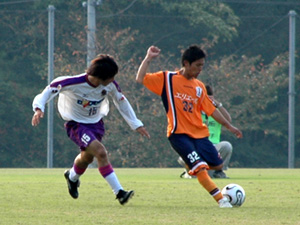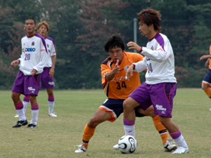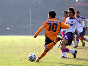 前半は一進一退の攻防。広島の佐伯君(西条出身)をはじめ、広島の中盤の選手がすばやくチェックにくるので、なかなかゴール前まで運べません。