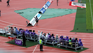 前半、突然どしゃ降り。しかし、運良く私が座った席はギリギリ屋根で守られた26列目。