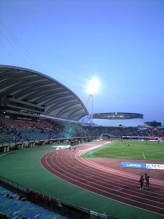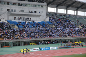 いわゆる国体向けの陸上競技場ですが、施設はまだまだ新しく、立派な電光掲示板もあります。