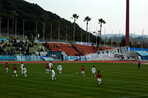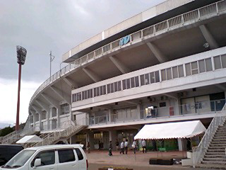 スタジアムはゴール裏の無いメインスタンドとバックスタンドがぐるっとコーナーまで回りこんでいる形状で、高さは低いものの、そう見難くはないです。