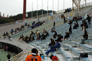 チケットが比較的高いメインスタンドの椅子がコンクリートに色を塗っただけなんですよ。
